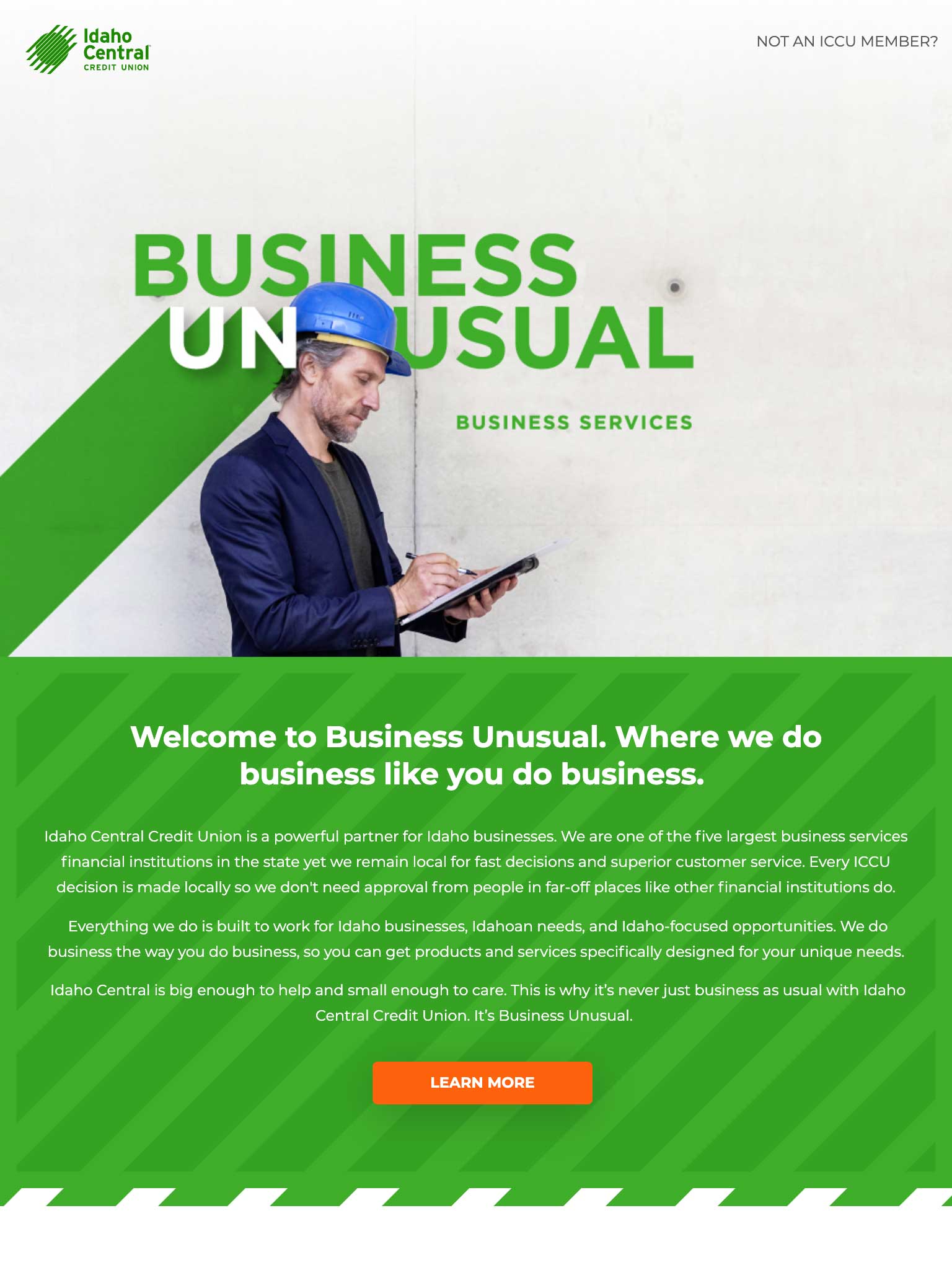 We launched the “BUSINESS UNUSUAL” campaign to show that Idaho Central is, “Big enough to help, and small enough to care.” This messaging platform was built on the brand pillars that ICCU is local, trusted, and personal. Delivering the personal attention and service that out-of-state financial institutions that answer to Wall Street only dream of.