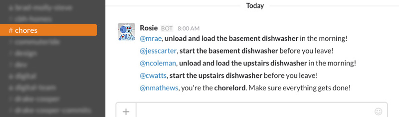 Meanwhile, we set up a Slack channel called #chores. This is where Rosie will post her assignments.