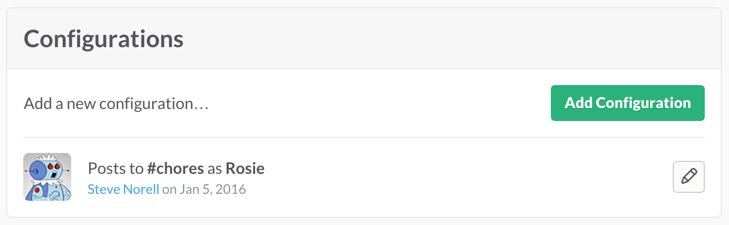 Using the provided Webhook URL, we wrote a little code to post messages to #chores as Rosie. Then, all we needed is a little code to glue it all together.