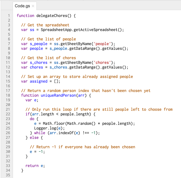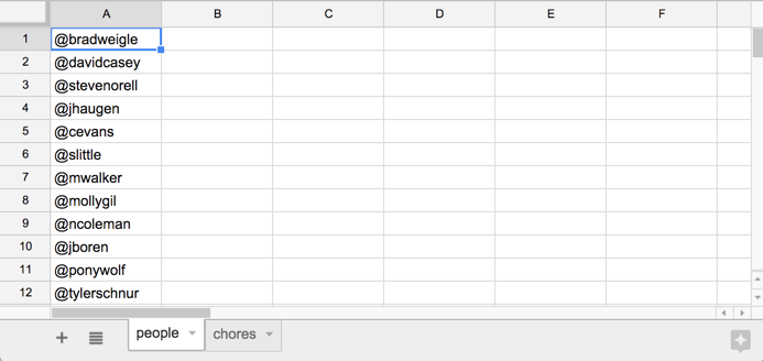 First, we needed a database to store usernames and chore descriptions. To handle this, we opted for Google drive, using a simple spreadsheet with individual sheets for people and chores.