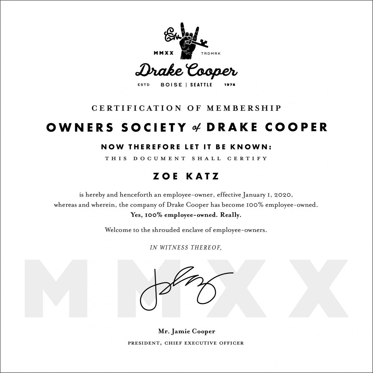 BOISE, Idaho — (December 16, 2020) — Drake Cooper, one of Idaho’s oldest advertising agencies, has 50 new yet very familiar owners. On December 1, CEO Jamie Cooper transferred 100% ownership of the company to its employees retroactively, creating a full year of stock accumulation for 2020. In a first for Idaho creative agencies and one of only a few in the Northwest, Drake Cooper is now an ESOP company.