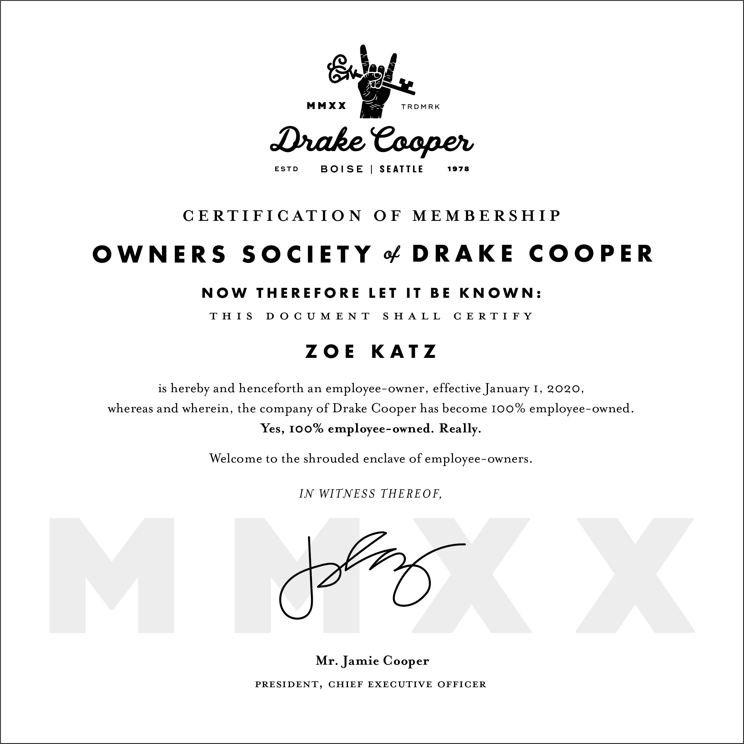 BOISE, Idaho — (December 16, 2020) — Drake Cooper, one of Idaho’s oldest advertising agencies, has 50 new yet very familiar owners. On December 1, CEO Jamie Cooper transferred 100% ownership of the company to its employees retroactively, creating a full year of stock accumulation for 2020. In a first for Idaho creative agencies and one of only a few in the Northwest, Drake Cooper is now an ESOP company.